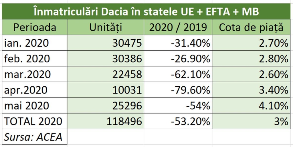 Evoluția mărcii românești Dacia, deținută de grupul francez Renault, a fost în continuă scădere în primele cinci luni ale anului. Conform raportului ACEA cu privire la înmatriculările din Uniunea Europeană, la care se adaugă Marea Britanie și statele EFTA (Islanda, Norvegia și Elveția), în perioada ianuarie – mai 2020 au intrat în circulație 118.496 de autoturisme Dacia, cu 53,2% mai puține decât în aceeași perioadă din anul anterior.