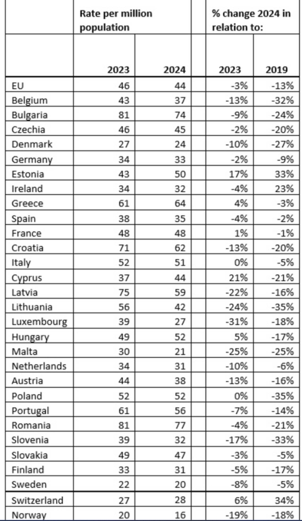 Chiar dacă au încă cele mai ridicate rate ale mortalităţii, România şi Bulgaria au înregistrat progrese semnificative în ceea ce priveşte reducerea deceselor rutiere, cu scăderi de peste 20% faţă de 2019. Concret, în cazul României, numărul deceselor cauzate de accidente rutiere în 2024 a scăzut cu 4% faţă de 2023 şi cu 21% faţă de 2019. În ultimii cinci ani, scăderi mari mari decât în România s-au înregistrat doar în Lituania şi Polonia (ambele cu o scădere de 35%), Slovenia şi Estonia (scădere de 33%), Belgia (declin de 32%), Danemarca (27%), Malta (25%), Bulgaria (24%) şi Irlanda (23%).