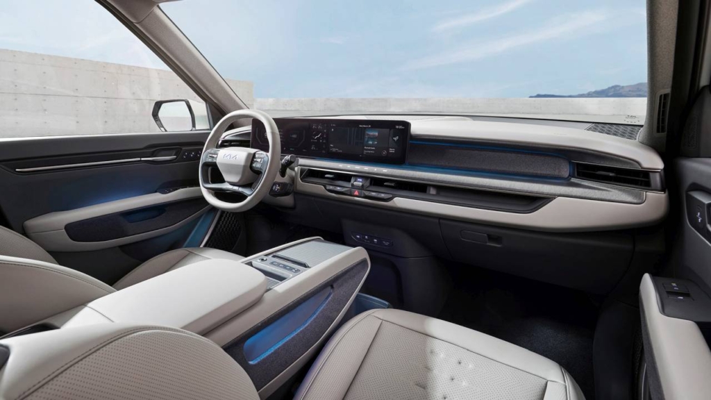 În interiorul cabinei spațioase, luminoase și aerisite, KIA EV9 întruchipează un design simplu și elegant ușor de utilizat. Tabloul de bord plutitor se extinde de la volan până în centrul automobilului. Două ecrane touchscreen de 12,3 inchi integrate cu un display de 5 inch îmbunătățesc experiența digitală, oferind control fără efort asupra funcțiilor automobilului. Consola centrală este echipată cu opțiuni ample de depozitare, inclusiv un compartiment spațios situat la baza sa.