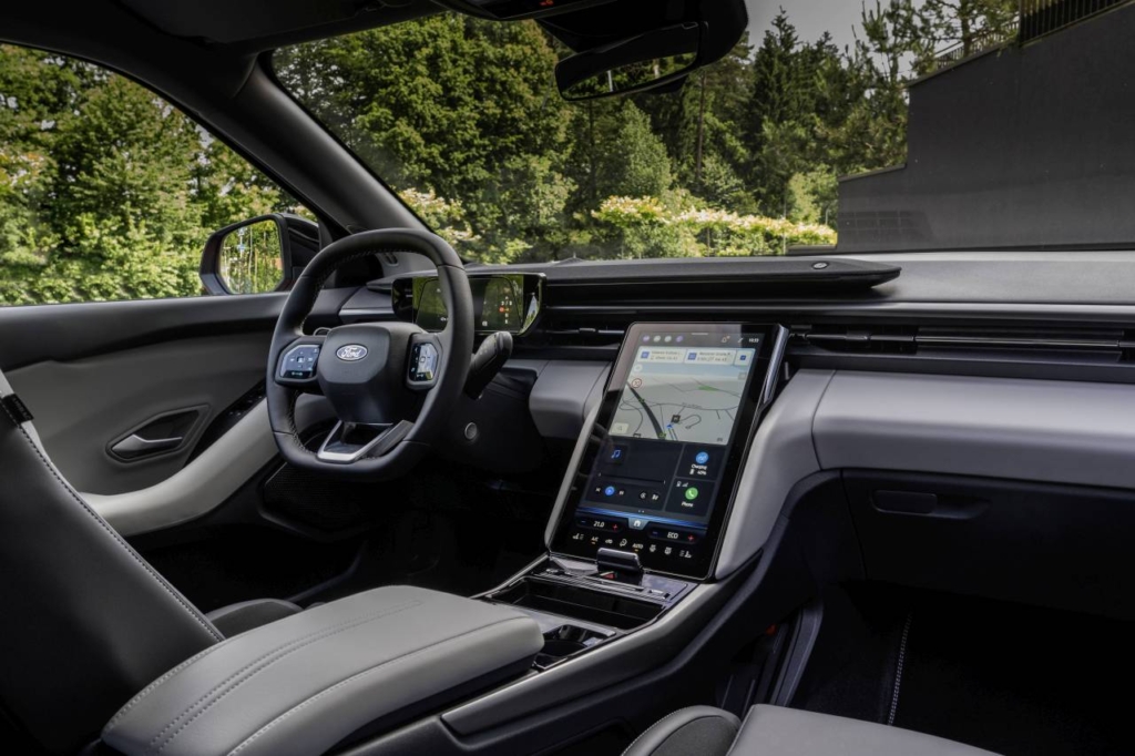 Merită evidențiate atât spațiile de depozitare bine gândite dintre scaunele șoferului și pasagerului din dreapta-față (care asigură un spațiu de 17 litri ce permite inclusiv depozitarea unui laptop de 15 inchi), cât și ecranul vertical de mari dimensiuni (SYNC Move, 15 inchi) care, pe lângă afișarea tuturor informațiilor relevante, poate glisa în funcție de dorința șoferului astfel încât să fie protejat de razele soarelui care pătrund fie prin parbriz sau geamurile laterale, fie prin plafonul opțional din sticlă. Mai mult chiar, această glisare dezvăluie sau ascunde complet un nou spațiu de depozitare care găzduiește și cele două prize USB-C din față.